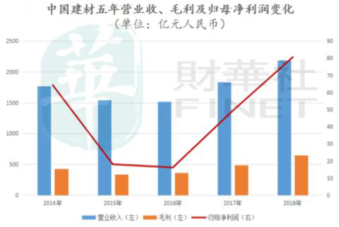 重组完成后交出首份年报的中国建材自然不甘落后,根据公司2018年财报显示,期内公司营业收入同比增长18.92%至2189.55亿元,毛利同比增长34.04%至650.88亿元,归母净利润同比增长63.33%至80.67亿元。